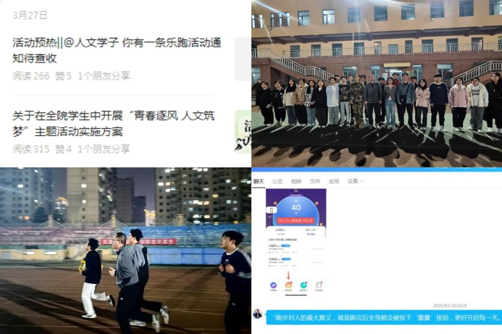 为教育引导同学们积极参加校园阳光跑活动,走出宿舍、走下网络、走向操场,人文学院在学生中开展“青春逐风 人文筑梦”主题校园乐跑活动。
