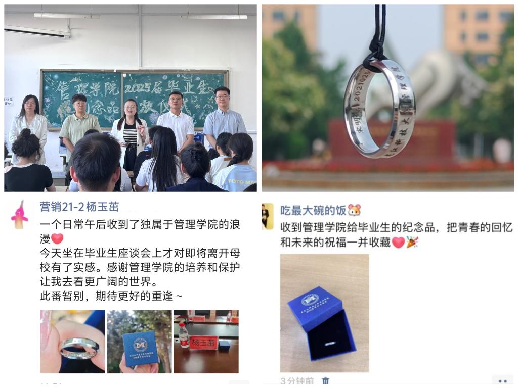 学院领导在座谈会上为与会毕业生代表发放纪念品,毕业年级辅导员同步召开学生干部会议并发放纪念品,一枚枚印刻着校徽、姓名、学号的专属纪念戒指诉说着管理学院847名毕业生作为“开云app登录入口人”的永恒记忆,更承载着母校对校友们最深惦念与祝福。愿全体毕业生怀揣这份“母校印记”,在中国式现代化的壮阔征程中奋楫争先,奋力书写无愧于时代、无愧于人民的青春华章。