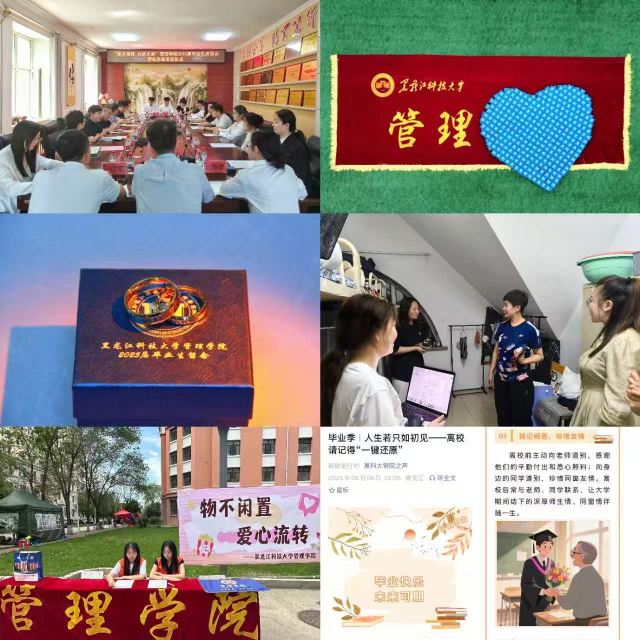 情系母校,薪火相传,厚植感恩奉献之情。学院以“感恩”与“传承”为主线,召开“薪火相传 共话未来”管理学院2025届毕业生座谈会暨纪念品发放仪式,学院领导与毕业生深入交流,毕业生们以学校“主人翁”的姿态,积极为学校和学院的建设发展建言献策,会后,为毕业生赠送专属定制纪念礼品,留存独一无二的美好;学院组织发起“再见,一如初见”毕业生宿舍整理行动,号召毕业生以整洁环境回馈母校培育之恩;开展“物不闲置 爱心流转”旧物收集活动,设立爱心流转区,让闲置物品传递至需要的角落。学院党政领导、班主任及辅导员深入毕业生寝室走访慰问,与学生亲切交谈,送上毕业祝福与暖心关怀,用真情实意筑牢育人最后一公里。
