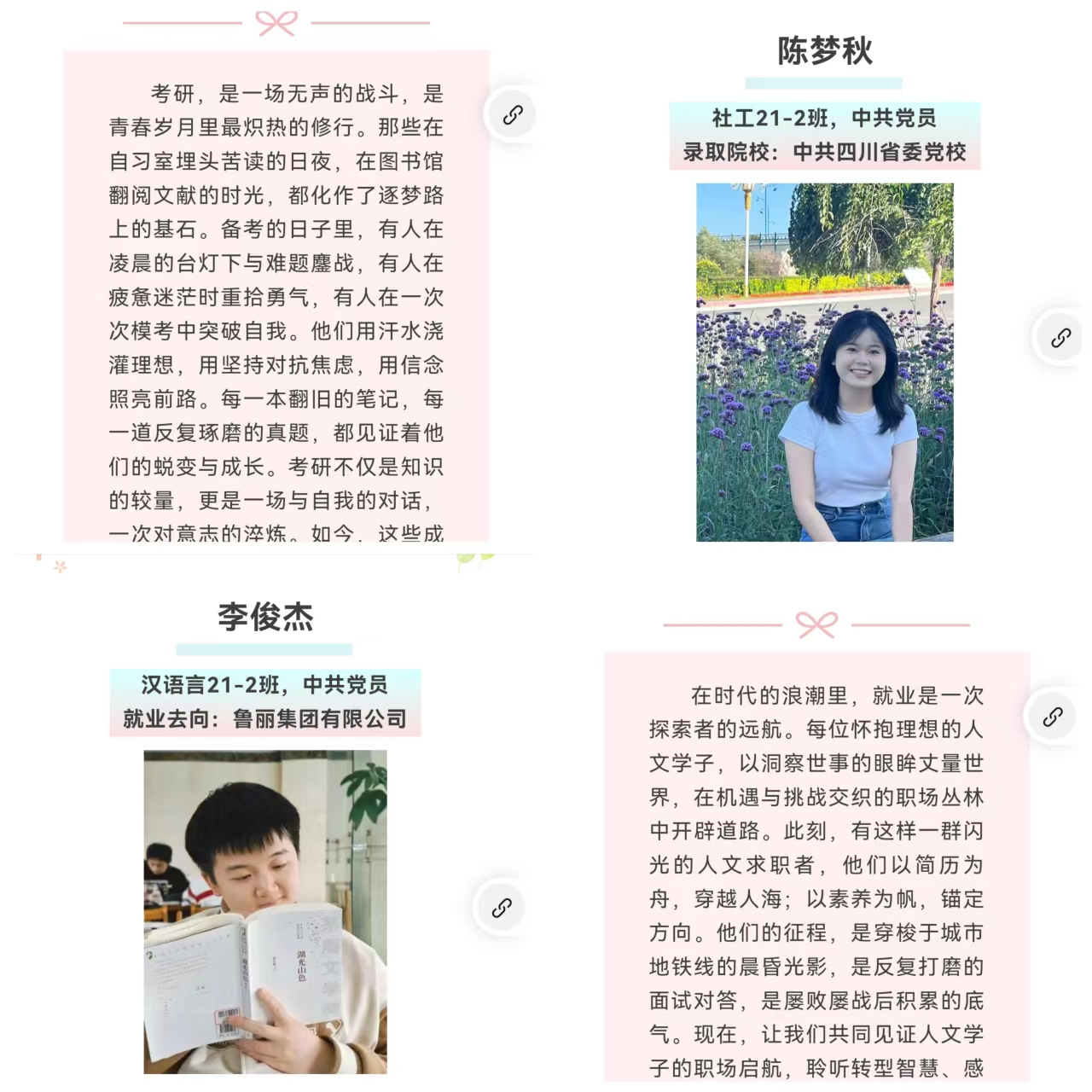 开展“青春理想”优秀毕业生先进典型事迹分享活动。学院在2025届毕业生中挖掘选树一批在考研深造、创新创业、职业发展等方面优秀的先进典型,将其脚踏实地的奋斗历程、攻坚克难的宝贵经验与深刻感悟在微信公众号专题推送展示,助力学子们从优秀毕业生的成长密码中汲取力量,将拼搏精神融入血脉,在新时代浪潮中勇立潮头、担当使命。