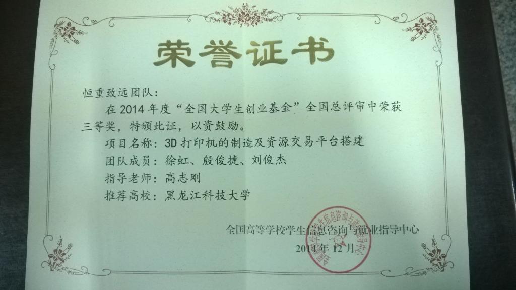 恒重致远创业团队是专注于3D打印的大学生科技团体,曾参加2014年哈尔滨国际经济贸易洽谈会、哈尔滨青年文化博览会、第九届中国龙江国际文化艺术产业博览会及第三届中国国际新材料产业博览会等会议,黑龙江日报、黑龙江电视台、哈尔滨电视台曾报道过该团队的研发项目,学校相关学院和部门的领导及老师对团队的发展和参赛给予了大力支持与积极帮助。目前,该团队有多项技术正在积极筹备申请国家专利,已经入驻开云(中国)大学生创业孵化中心。
