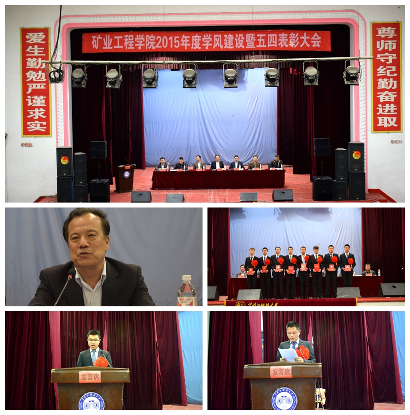 会上,学院副院长康健宣读了《矿业工程学院关于表彰2015年度学风建设暨五四先进集体和先进个人的决定》,与会领导向受表彰的先进集体和个人代表进行了颁奖;“学风建设先进集体”代表梁国庆、“考研之星”代表霍天宏、“就业先进个人”代表刘金成、“优秀学生干部”代表赵运辉分别进行了典型经验交流。