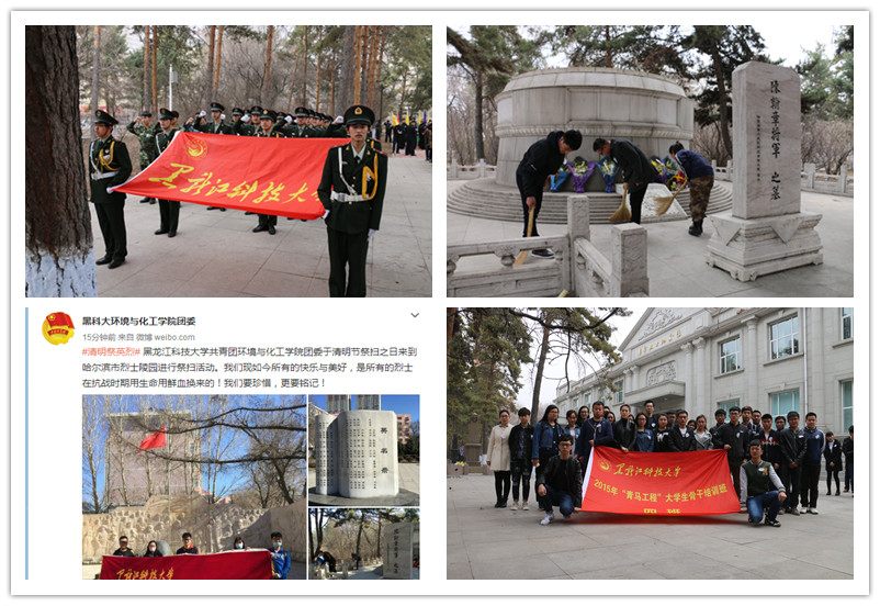 “清明祭英烈·共铸中华魂”清明祭扫活动。清明节期间,全校各级团学组织通过宣传、教育等手段,围绕“清明祭英烈·共铸中华魂”主题宣传教育活动开展了祭扫烈士陵园、革命历史讲座、英烈事迹宣传展等丰富多彩的纪念活动。校团委,电子与信息工程学院、建筑工程学院、经济学院、安全工程学院、环化学院、电气与控制工程学院等分团委分别组织“青马工程”培训班学员、大学生仪仗队队员、青年志愿者和学生干部骨干近300人分批到哈尔滨烈士陵园开展了以“清明祭英烈·共铸中华魂”为主题的清明祭扫活动;理学院团委组织13名学生骨干参观了位于哈尔滨市平房区的“侵华日军第七三一部队遗址”,重温了入团誓词;矿业工程学院团委在靖宇公园开展以“祭先烈,宣鸿志”为主题的祭扫活动;建筑工程学院、计算机与信息工程学院、电气与控制工程学院开展了以“青山埋忠骨,英魂我传承”、“清明印象”、“清明节”等主题宣传海报展;人文社会科学学院、外国语学院召开了“百位革命先烈,百篇革命小传”、“心中不灭的红色丰碑”为主题的红色故事讲座活动,引导广大学生敬先贤、颂英烈,用革命先烈的光荣事迹培育当代大学生的爱国情怀和道德情操。