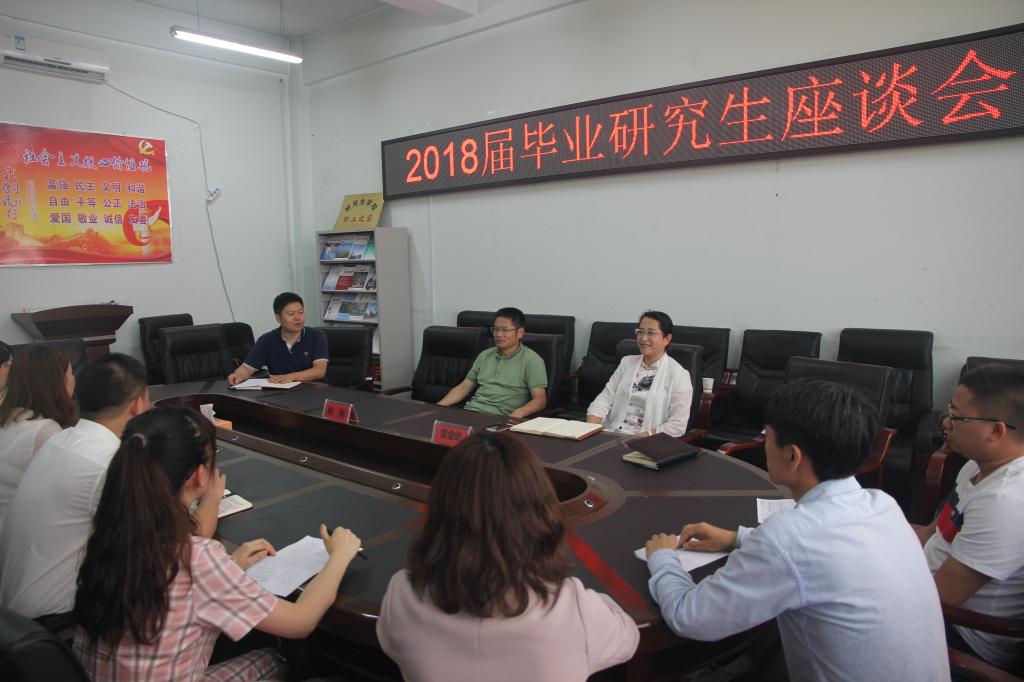 6月21日下午,研究生学院在会议室召开2018届毕业生代表座谈会。院长胡刚、副院长雷金屹、辅导员马超群及毕业生代表欢聚一堂,依依话别,共叙情谊。座谈会由学工办主任侯树成主持。