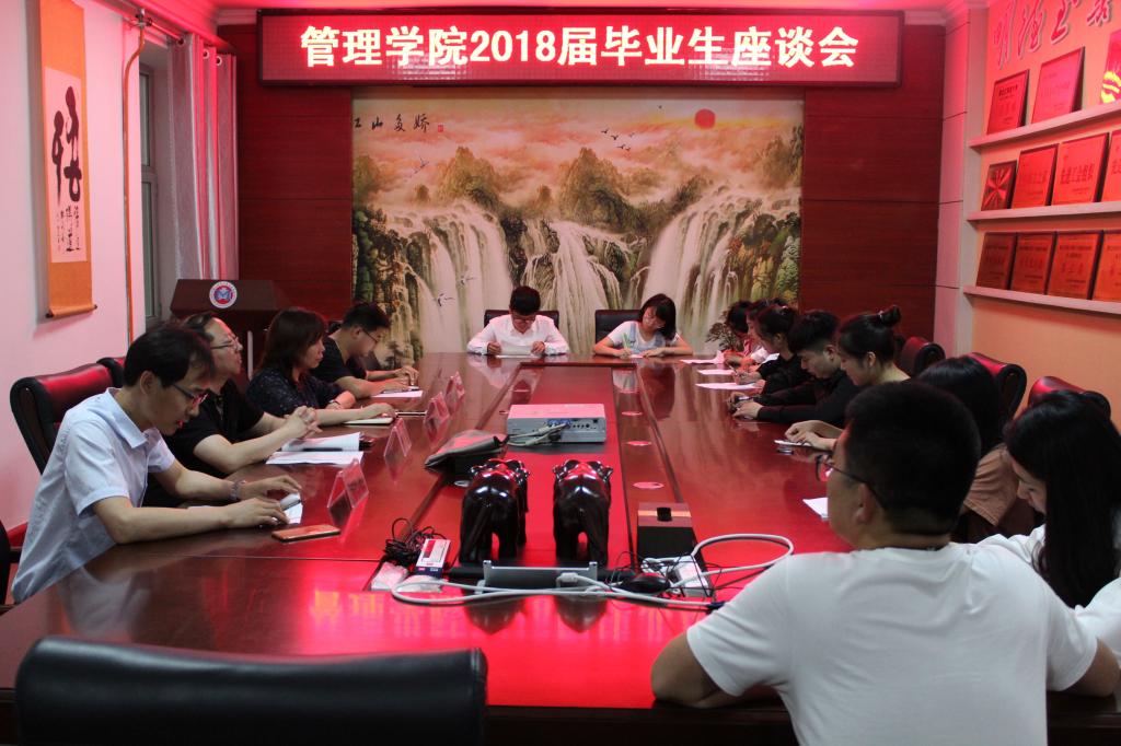6月25日下午,管理学院在学院三楼会议室召开2018届毕业生座谈会。学院党委书记王维杰、副院长郭红、学工办主任孙亚鹏、团委书记左巍参加了座谈会。座谈会由学工办主任孙亚鹏主持。