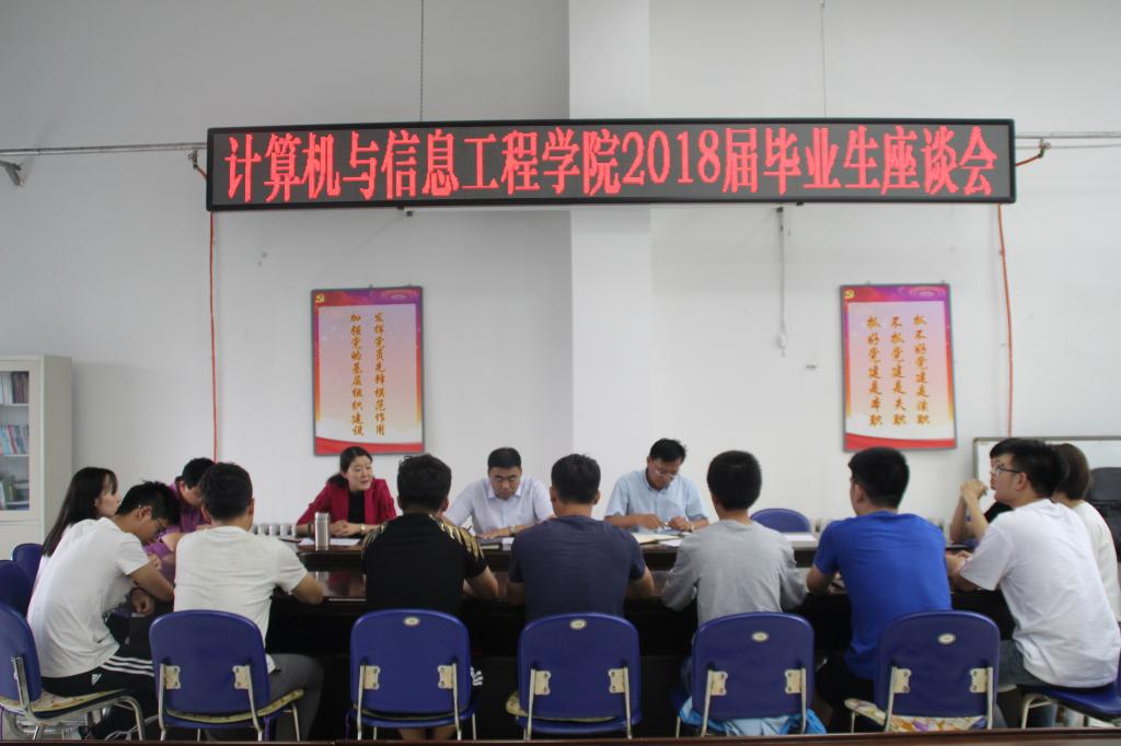 6月25日下午, 计算机学院在学院三楼会议室召开了2018届毕业生座谈会。座谈会上,10名毕业生结合自己四年大学生活,为学校和学院提出了许多中肯的意见和建议,计算机学院院长董春游从“3+1”人才培养模式、学风建设、培养方案设置、课程建设、教材建设、就业指导、实验室建设、大学生创新基地建设以及体育能力培养、社团活动等方面与毕业生们进行了深入的沟通和交流。