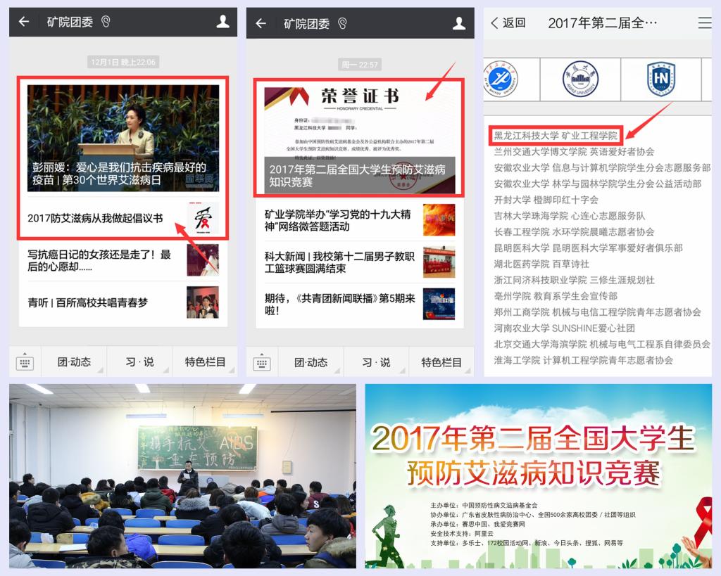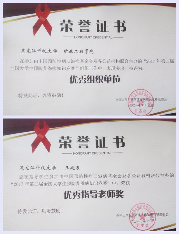 12月31日,由中国预防性病艾滋病基金会主办、多家单位承办的“2017年第二届全国大学生预防艾滋病知识竞赛”落下帷幕。开云(中国)矿业学院作为全国500余家高校团委/社团等组织之一积极承办了本次活动。参赛期间,矿业学院积极筹备、扎实推进,共组织300人参赛,由于表现突出,学院荣获“优秀组织单位”荣誉称号,辅导员王延春荣获“优秀指导教师奖”,宋雨薇等同学荣获“优秀志愿者”荣誉称号。