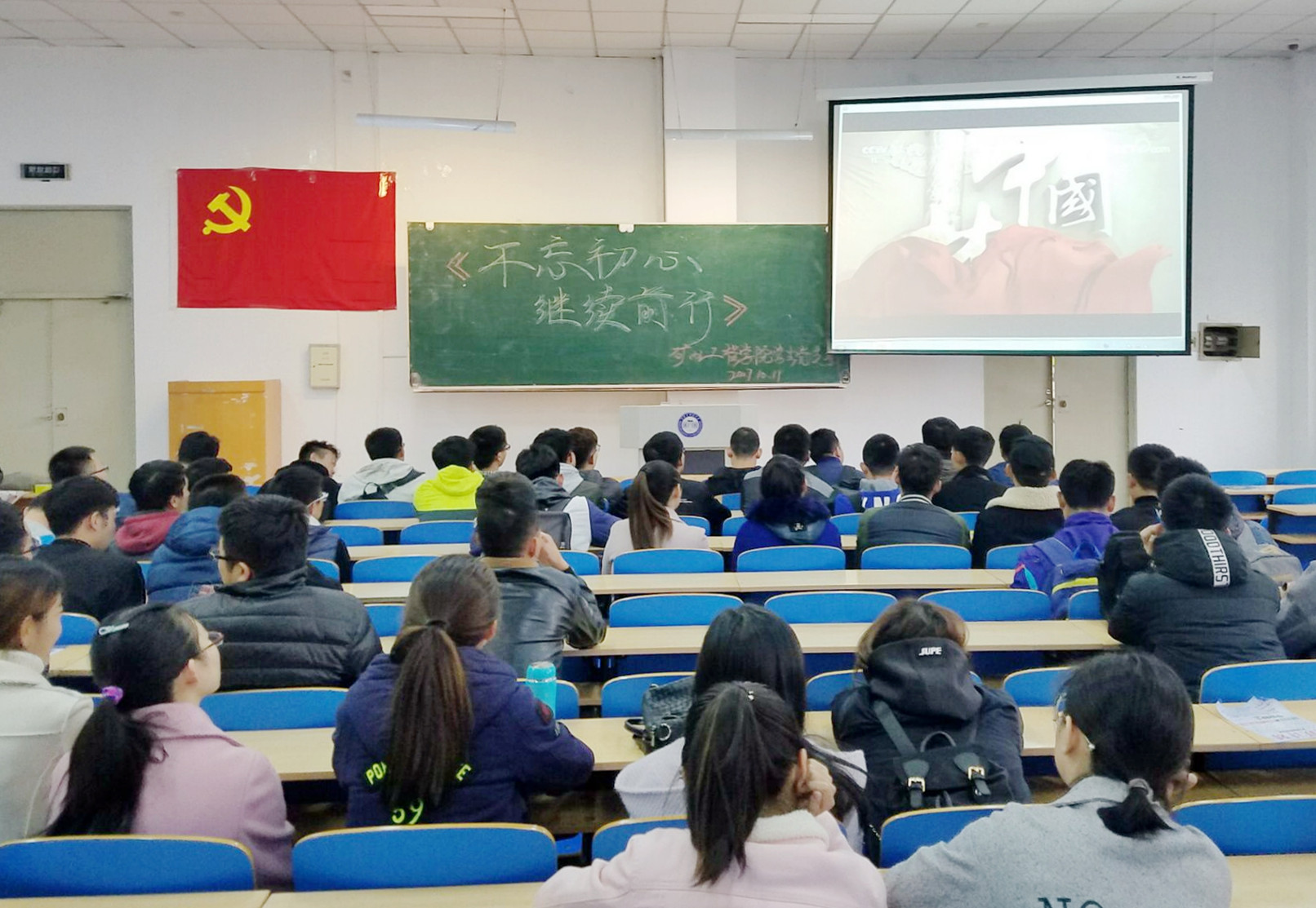 10月11日中午,矿业学院学生党支部在主楼EN0101召开全体党员大会,集中学习观看了电视政论片《不忘初心继续前行》的第一集《举旗定向》。学院学生第二党支部书记王延春出席会议。