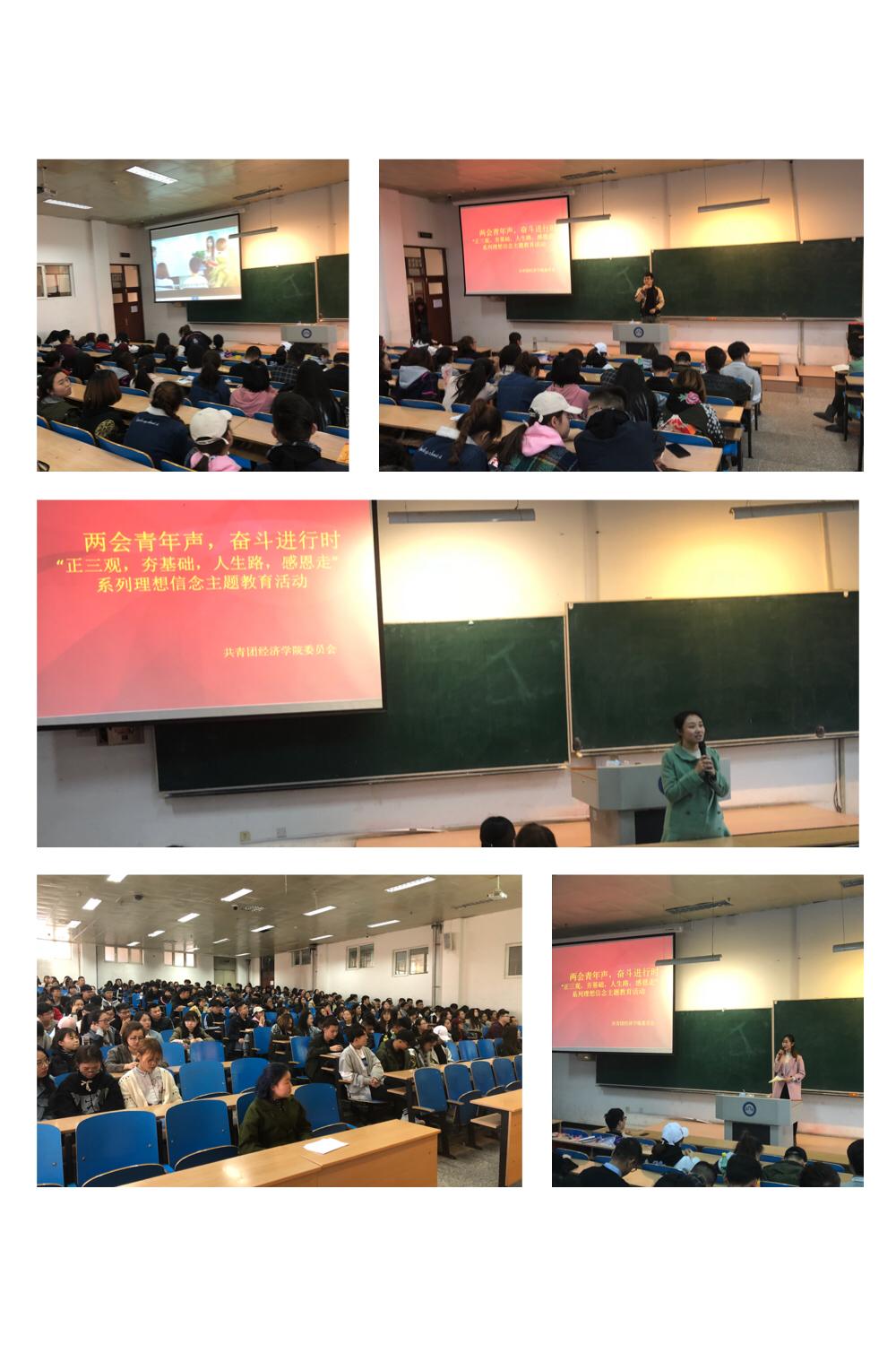 为进一步贯彻党的十九大精神,落实学校党委下发的《关于在学生中开展“正三观夯基础人生路感恩走”主题思想教育活动的落实方案》,按照《经济学院关于在学生中开展“正三观夯基础人生路感恩走”主题思想教育活动的落实方案》具体要求,经济学院于3月22日下午15时在主楼WS0303举办了“两会青年声,奋斗进行时”理想信念主题教育学习活动。