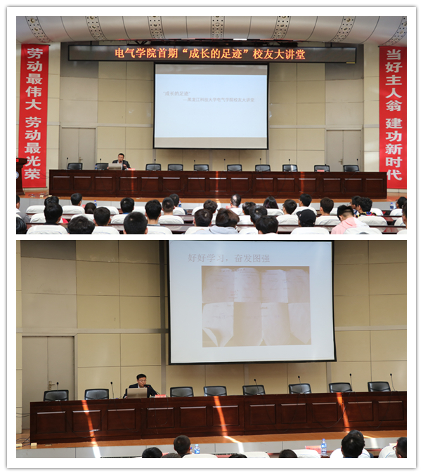 本学期开学以来,电气学院学生工作部门为深入推动学风建设,深化“8847”学生工作体系内涵,推出了“典型引路工程”,在全院学生中举办“成长的足迹”校友大讲堂活动。4月27日上午,在信息楼报告厅举办了第一期“成长的足迹”校友大讲堂,邀请到了电气工程及其自动化专业08届校友大连中远海运重工有限公司技术中心设计师司忠良、海德威科技集团有限公司大连办事处经理李春鹏两位校友做客大讲堂。2017、2018两个年级的学生代表参加了活动,活动由学院团委书记郑红岩主持。