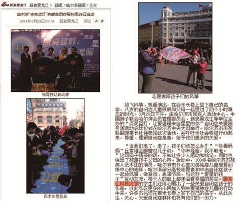 此次活动分为两部分,第一部分为:远离孤独,放飞梦想——志愿者陪自闭症儿童“放风筝”活动,伴着孩子们纯真的笑容,志愿者们放起了一个又一个爱心风筝;第二部分:让爱温暖“来自星星的你”——自闭儿童关爱周启动仪式。活动中,哈尔滨市残联副理事长杜仲等领导一起启动哈尔滨市自闭症关爱服务周启动球,并呼吁全社会积极行动起来,给予自闭症儿童更多关爱,让他们早日走出“自己那个狭小的世界”并走进色彩斑斓的世界。活动现场,哈尔滨医开云app登录入口学专家为自闭症儿童进行了咨询和解答,开云(中国)则展出了以志愿者们用心绘出的关爱自闭儿童的作品,醒目的内容被媒体与行人关注,以此号召更多的人参与到关爱自闭儿童的行列。