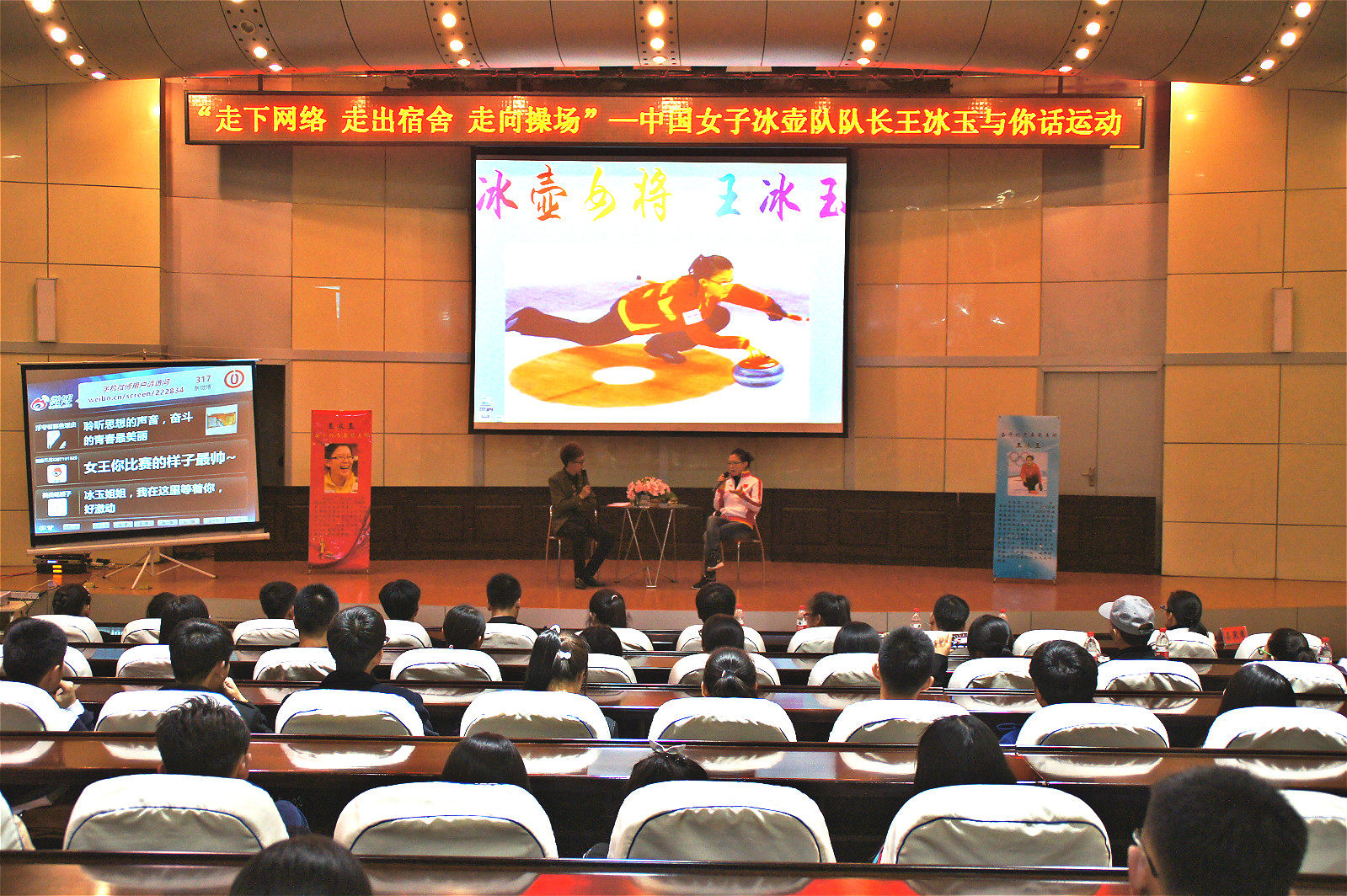 整场活动以访谈的形式进行,通过 “昨天、今天和明天”三个篇章,使在场的师生对冰壶女王有了更加全面的了解。王冰玉时而专业严谨,时而幽默诙谐的回答更让大家记住这个从小开始接触冰壶,多年来不畏艰辛、奋力拼搏的冰城姑娘。王冰玉和我们分享了2009年世界锦标赛上中国女子冰壶队用9年时间为中国夺得冠军的激动和骄傲。通过访谈的进行,在场师生真切感受到了一名运动员代表国家参加赛事的那份责任感和背后所付出的磨难、艰辛与超乎常人的执着。王冰玉的沉稳执着、有勇有谋以及勇于拼搏的精神打动了在场每个人,她说“人生中对我来说最重要的四个字是‘珍惜’和‘感恩’”,“生活给予我的无论是好是坏,我都照单全收”,“出国比赛代表的不是我个人,无论走在哪里人家会说这是中国队的”最朴实的话语道出了那份对竞技体育的坚持不懈和对国家、对队友使命在身的责任感。王冰玉用实际行动向我们诠释了什么是“奋斗的青春最美丽”。她和同学们分享了一句话“Always remember how good you did,and you can do it be better(永远要记得自己曾经的耕耘并相信你一定会做的更好)”,鼓励同学们要相信自己的选择并为之付出努力。当谈及训练的枯燥和给身体带来的伤痛时,她说“是信念让我坚持,挫折只是对我的考验”,“虽然有想过放弃的时候,但那只是一刹那,因为我不是一个人在战斗”,“梦想贵在于坚持”。当谈及今后是否继续参赛,2022年在我国承办的北京冬奥会是否还会看到她的身影时,她说“很少有运动员能够在运动生涯中能够参加在自己国家举办的国际赛事,这是可遇而不可求的,既然我能如此幸运,那我为什么不努力去争取参加呢”,王冰玉还和全场观众相约2022年北京冬奥会冰壶比赛现场。她对国家热爱、对冰壶事业感恩,这种家国情怀和感恩态度令在场师生动容,一次次掀起雷鸣般的掌声。