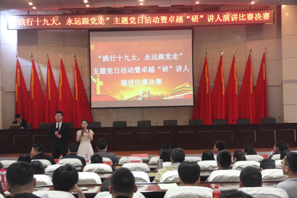 为深入学习宣传贯彻党的十九大精神,把全体研究生思想统一到党的十九大精神上来,5月7日,研究生学院在办公楼报告厅举办了“践行十九大、永远跟党走”主题党日活动暨卓越“研”讲人演讲比赛决赛。研究生学院院长胡刚,校团委副书记苗雨莅临活动现场。比赛评委由校团委马紫微,研究生学院陶金、侯树成、马超群及校研究生会主席姜楠、研究生学院分团委副书记任雨婷担任。