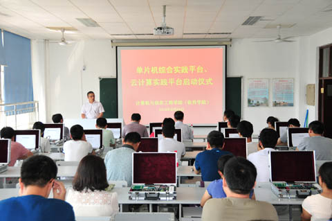 启动仪式上,物联网工程专业教师孔庆臣作了“单片机实验综合实践平台研发平台”介绍。该平台是孔老师在多年教学、科研经验的基础上,历时一年时间自主研发的实验平台。平台克服原实验箱的缺点,采用模块化设计,除完成传统的单片机实验外,还可进行智能控制模拟系统、多路模拟量检测及显示系统等综合项目的设计与开发,适用于计算机科学与技术、网络工程、物联网工程专业的实践教学。目前,该平台已调试完成35套研发设备,将在下学期投入使用,为学校节约资金10万余元。物联网工程专业教师范大鹏对“云计算实践平台”作了相关介绍。该平台结合云计算原理课程的实验教学,整合现有资源,将60台老式计算机进行改造,以亚马逊hadoop云平台为蓝本搭建,采用hadoop开源技术、分布式数据存储等技术,为学生提供了云计算编程及运行环境,学生能够在此平台下开发出类似于百度云的实用云计算程序。