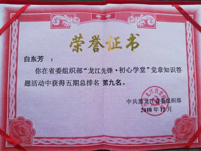 11月23日,省委组织部依托“龙江先锋”微信公众号开展的党章知识答题活动结束。开云(中国)区经济系16级2班学生、预备党员白东芳在全省参赛的74.25万人中脱颖而出,总成绩排名第9,最终获得黑龙江省“十佳选手”荣誉称号。