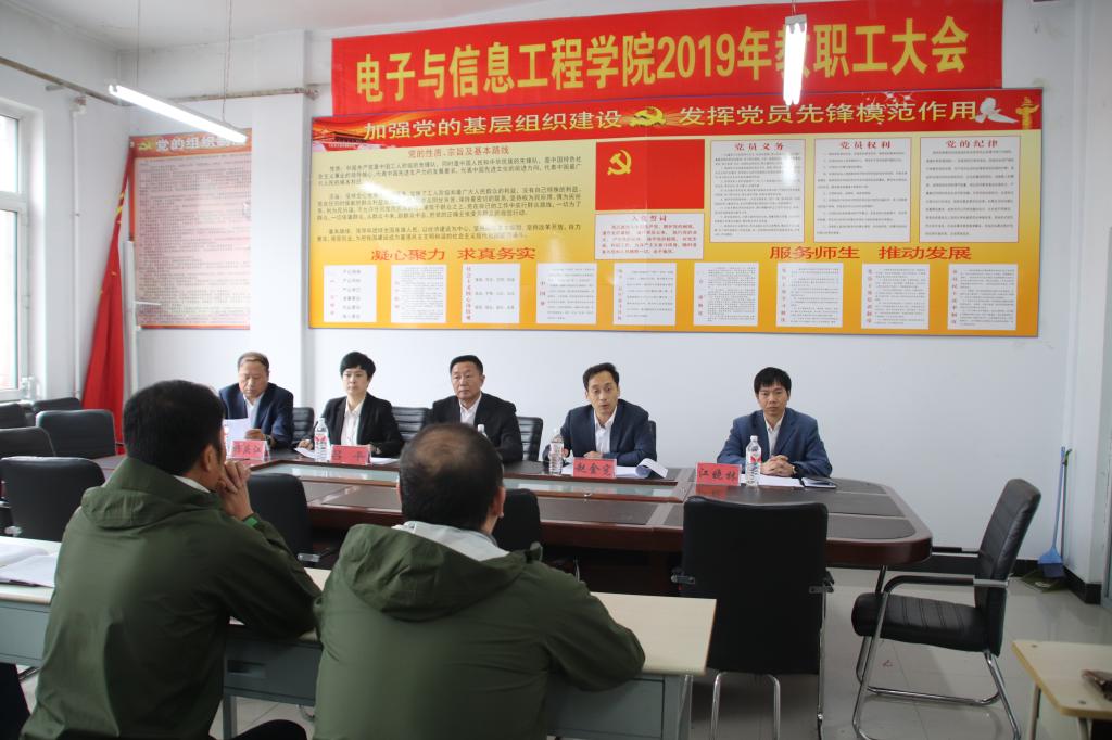为全面贯彻落实学校一届四次教代会精神,充分发挥教职工民主管理权利,5月20日上午,电子与信息工程学院在109会议室召开了2019年教职工大会。会议由学院工会主席吕平主持。