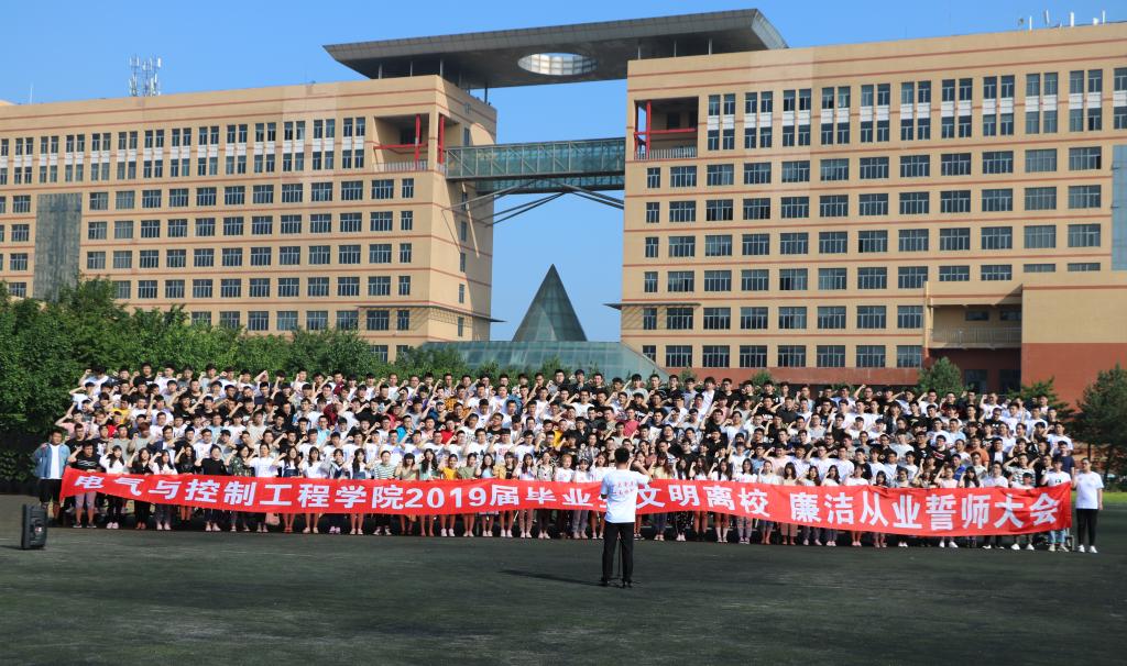 6月12日,电气学院在足球场组织召开电气学院2019届毕业生文明离校、廉洁从业誓师大会,电气学院领导班子全体成员、各教研室主任、副主任、全体辅导员、毕业班班主任及全体2019届毕业生参加大会。
