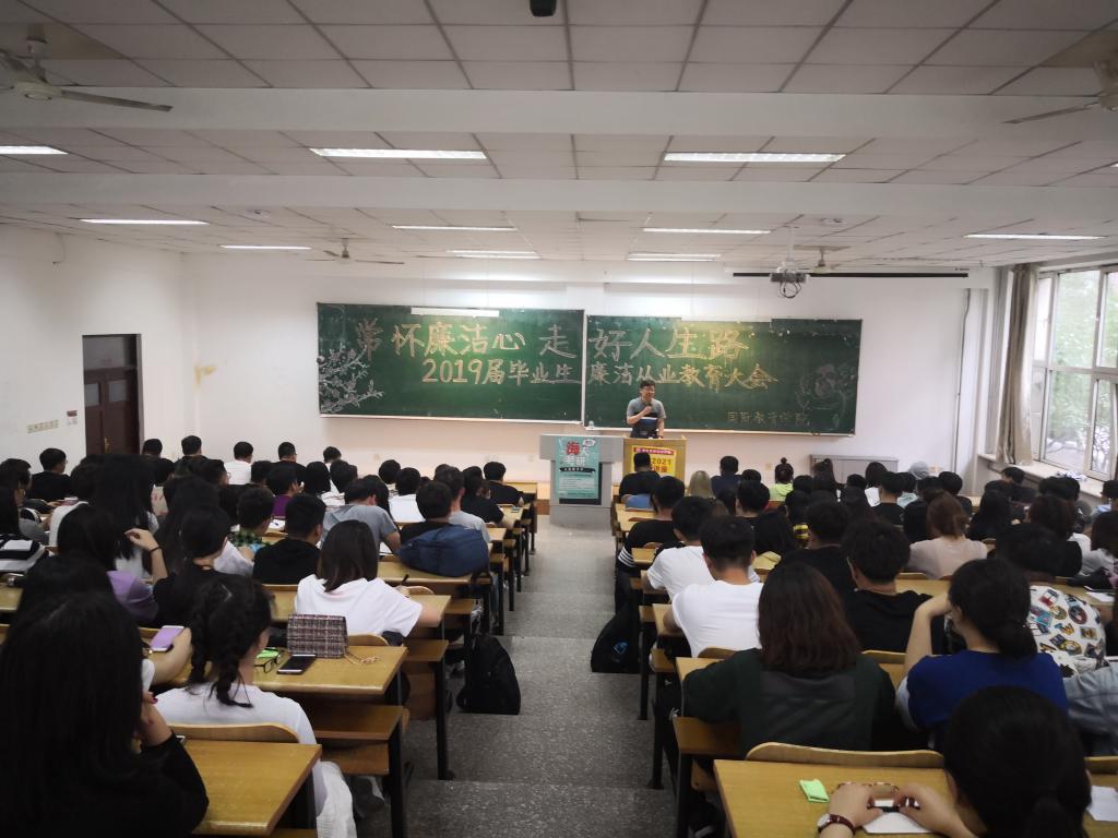 6月13日下午,国际教育学院在科技大厦S101组织召开了“常怀廉洁心、走好人生路”2019届毕业生廉洁从业教育大会,全体2019届毕业生参加。国际教育学院党委书记邬承斌出席并讲话,会议由学院学工办主任徐海英主持。
