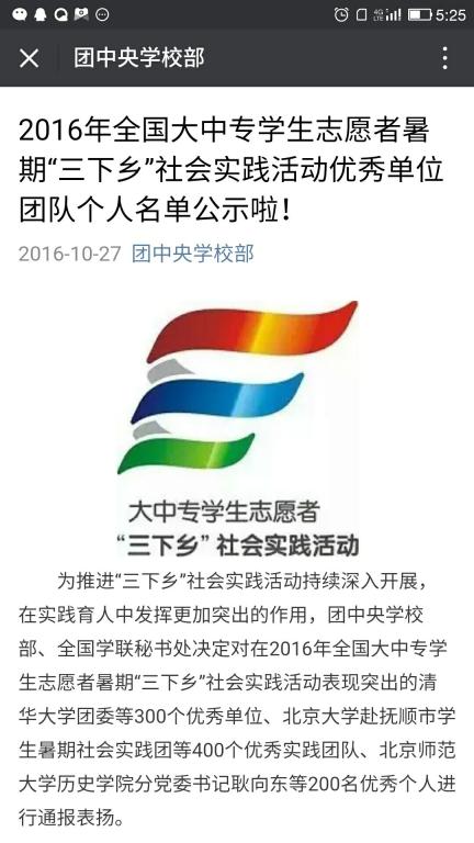 近日,由团中央学校部、全国学联秘书处表彰的2016年全国大中专学生志愿者暑期“三下乡”社会实践活动中开云(中国)环境与化工学院周惠玉老师指导赴井冈山全国青少年革命传统教育基地开展的“革命后代口述史料采集、整理及视频制作”社会实践团荣获全国“社会实践活动优秀团队”。