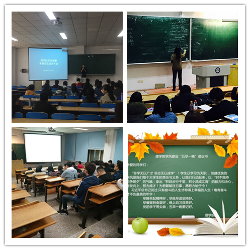 围绕主题抓学风 理学院围绕学风建设开展了“五早一晚”主题教育活动,发出了“早睡早起精神好,早练早读坚持好。早餐留到食堂好,晚上自习效果好。党团学干带头做,五早一晚要记好”的号召,引导广大学生珍惜时间,利用好早晚自习,努力学习。