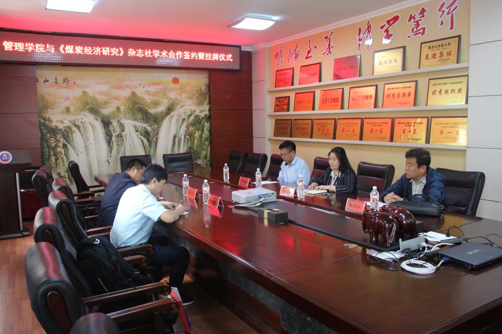 5月17日下午,管理学院与《煤炭经济研究》杂志社学术合作签约揭牌仪式在管理学院三楼会议室举行。《煤炭经济研究》杂志社副主编辑李修东、新媒体中心主任宋晓波,管理学院院长谭旭红、副院长陈培友、崔清泉以及管理学院部分学术骨干教师。签约仪式由陈培友主持。