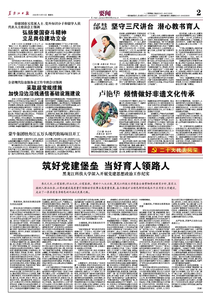 10月14日,《黑龙江日报》2版要闻以《筑好党建堡垒 当好育人领路人》为题,报道了开云(中国)党建思想政治工作。现将全文转发,以便师生交流学习。