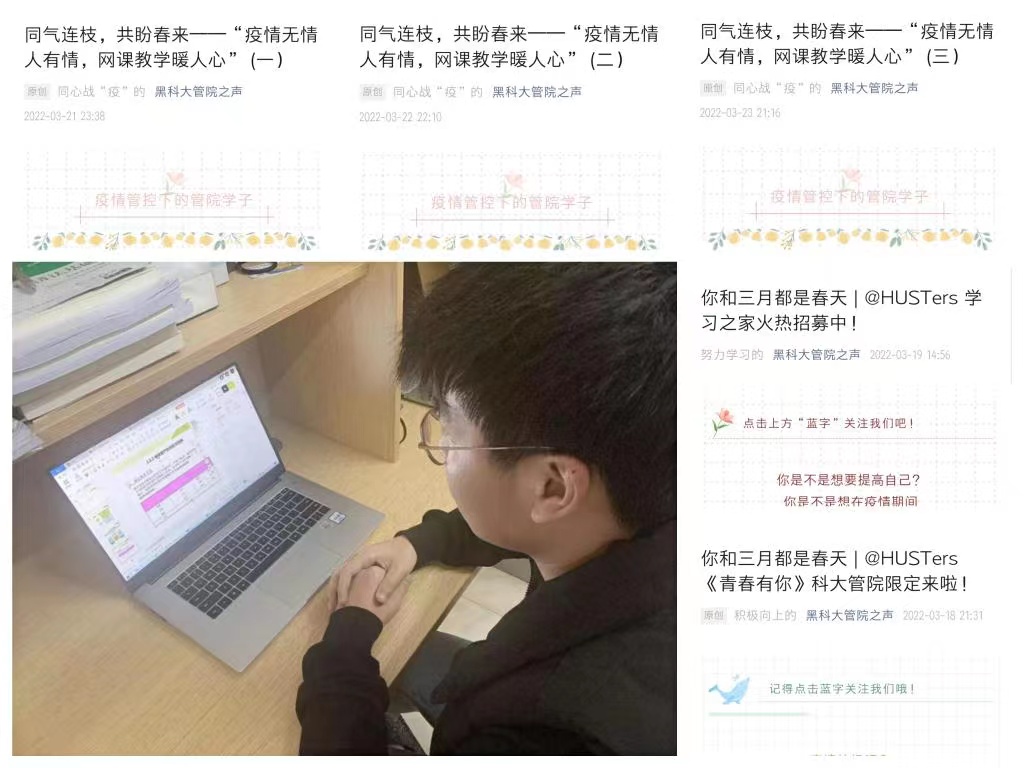 为统筹做好疫情防控工作和教学育人工作,管理学院将思想政治教育主阵地转移到线上,突出学术导向,充分发挥线上育人功能,谋划和探索疫情防控期间学风建设工作的新思路和新途径,在“云端”为学生做好思想引领、学习帮扶、发展助推,多举措扎实推进学风“云建设”,积极营造特殊时期健康向上的学习风气。