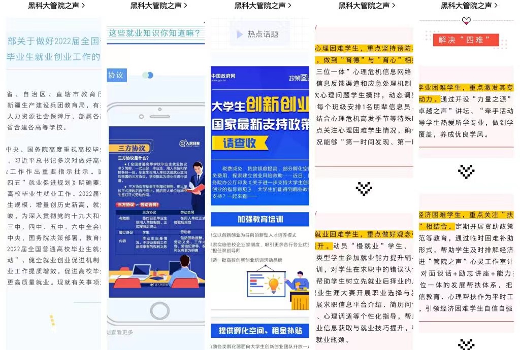 “云就业”导航,优化就业管理服务。学院以“帮”促学,积极推送就业信息,开通就业云服务,对简历、面试、就业形势分析等进行“云辅导”,着力解决学生在就业中遇到的问题,做到“线上指导不停歇,就业服务不打烊”。