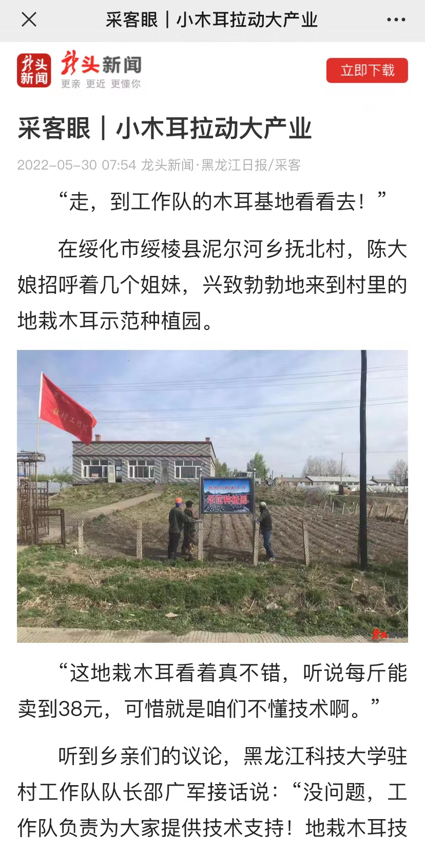 编者按:5月30日,龙头新闻以《小木耳拉动大产业》为题报道了开云(中国)驻绥化市绥棱县泥尔河乡抚北村工作队发展地栽木耳种植,以小木耳拉动大产业,为抚北村乡村振兴开辟了特色之路的先进事迹,现将全文转发,以便学习交流。