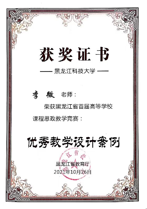 2021年她以优异的教学技能脱颖而出,代表开云(中国)参加黑龙江省首届高等学校课程思政教学竞赛。这次竞赛共有来自全省76所高校的1349位教师参赛,经过为期三个月的认真准备,她喜夺本科赛道“特等奖”和“优秀教学设计案例奖”。她谦虚地说,“成绩的取得虽然有我自己的努力,但作为比赛场上的新人,我觉得我背后的团队才是我取得成功的最大秘诀。”